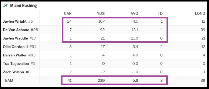 Achane averaged 13.1 yards per carry! Wright a hundred-yard game!